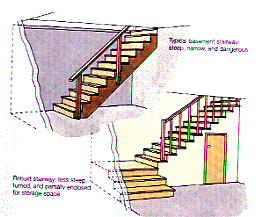 Es una ilustración de una escalera amplia, split. Aunque esta escalera incluye un giro, es mucho más seguro que el tipo recto, estrechas. El aterrizaje sirve para romper una caída y a piezas más pesadas como son llevados o fuera del taller del sótano.