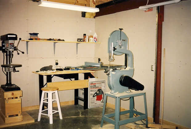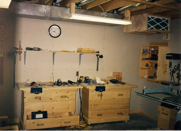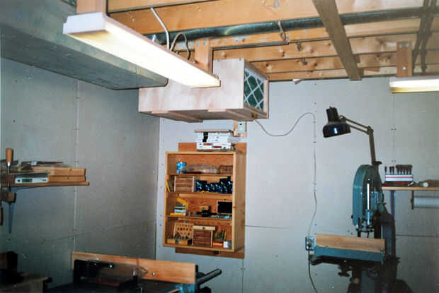 He añadido la serie de cuatro fotos para demostrar cómo un área de sótano se puede convertir en un espacio de taller para trabajar la madera. Se trata de fotografía digital vintage de uno de mis primeros talleres hace más de 20 años. El taller fue cerrado con muros y una puerta para contener cualquier polvo generado y aislarlo del resto del sótano. Una ventana fue agregada más adelante para permitir que la luz ambiente del resto del sótano para entrar en el área del taller.
