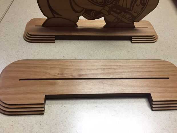 Ahora empezar a ensamblar la base. Trabajar con 2 piezas de base a la vez, pegarlos uno encima del otro, alineando las muescas de la placa del cuerpo. Sujete la pieza 2 juntos hasta que se seque. Cuando alineando las piezas con la abertura más pequeña en ellos para el cuerpo principal, utilizar los desechos de la parte de la raja para alinear los agujeros hasta que se seque. Después de cada set de 2 es seco, empezar a pegar las pilas de 2 piezas uno al otro. Ahora deslice el cuerpo principal las 4 capas superiores de la base y el pegamento. Esto asegurará que son perfectamente alineados y pegados en su lugar. Apretar y dejar secar. Por último, unir toda la pila y la abrazadera.