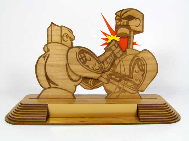 El último paso es pegar la placa en la ranura que se creó para él en la parte delantera del trofeo. Ahora tienes una pieza grande, personalizada a mano que el afortunado ganador!