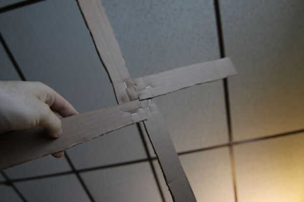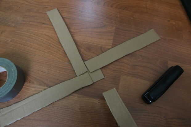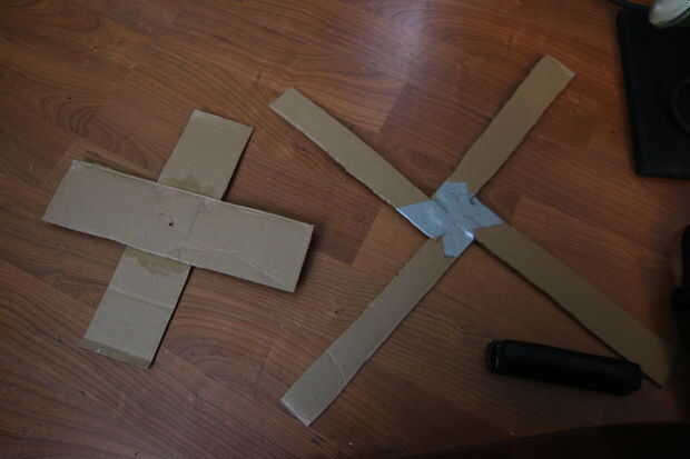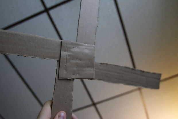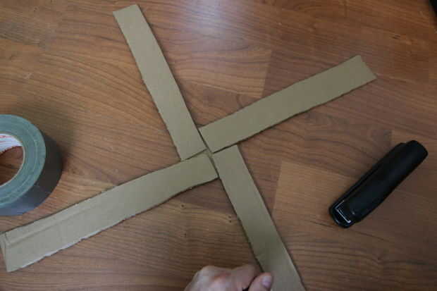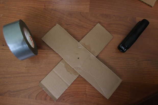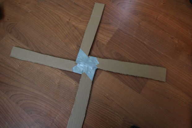 En las imágenes de abajo que simplemente trató de encontrar un buen centro punto / punto de equilibrio para el centro del ventilador. Luego grapar la cinta pato juntos y agregado de piezas si es necesario para un apoyo extra.