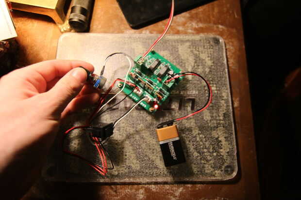 A continuación puede conectar en el motor y el interruptor. Girar el potenciómetro (botón) para ajustar la velocidad. El motor debe comenzar dar vuelta y el cartón con él. Este motor está diseñado para ir lo suficientemente rápido como para la apariencia que desea y más lenta que cualquier ventilador estándar funciona. Los resultados son bastante chulas y si experimentar con la forma de abanico y la distancia de la luz puede que se sorprenda en lo que puede lograr
