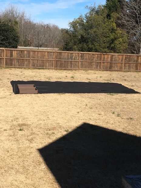 Nota: Si no tienes una zona de nivel tendrá que preparar uno. Las camas que utilizamos permiten ligeras variaciones por un par de pulgadas pero el área debe estar plana y nivelada. Medida de un rectángulo de 26,5 pies largo por 14 pies de ancho. Si tienes césped o maleza usted debe del cuero cabelludo lo hacia abajo con un whacker malezas o cortacéspedes. Si desea rociar con asesino de hierba puede sin embargo hicimos no como nuestra hierba era latente. Coloque tela de hierba para cubrir el área medido y permitir una superposición de cuatro pulgadas entre hileras. Grampas con paisaje resistente grapas a medida que avanza. Nuestra foto muestra este paso completado con una caja montada y colocada.