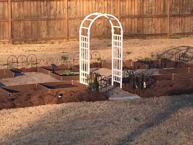 2 yardas de piedra del guisante de Indiana fueron agregados al interior de la parcela cubriendo todo la tela de mala hierba a varias pulgadas de profundo. Un camino fue agregado por el eje y el borde del buffer 4 ft agregado en el paso 5. Hormigón piedras agregaron desde el buffer, a través del eje, a la característica de agua. 6 balas de paja de pino fueron agregados alrededor de toda la zona tampón de jardín.