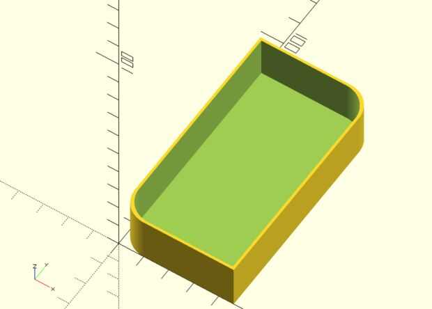 Ahora tenemos una caja llena, semi redonda, que ya es buena. Pero para poner las cosas en, tenemos que crear paredes y abren en la parte superior. Funciona creando un cuadro segundo, más pequeño y colocarlo dentro de la primera de ellas. Luego usamos la OpenSCAD función difference() que corta el primer modelo con la segunda que colocamos dentro.