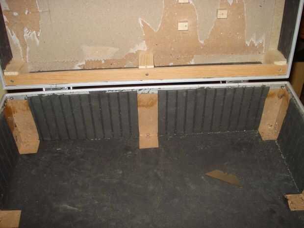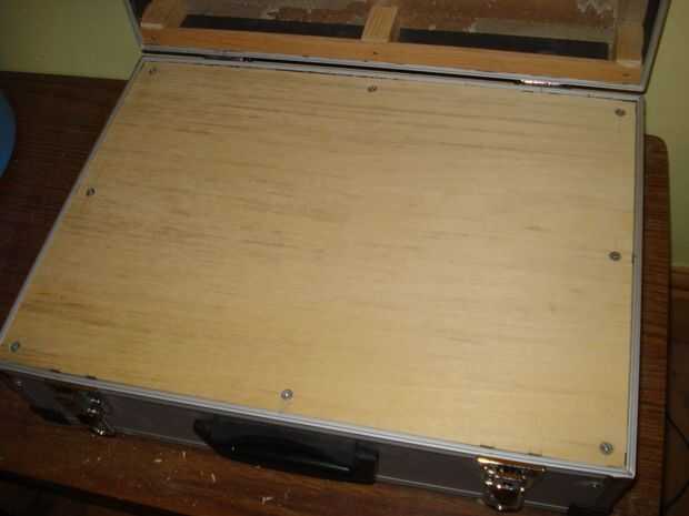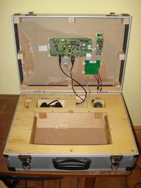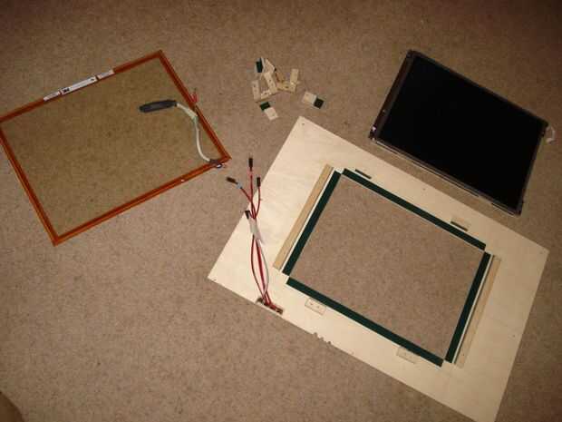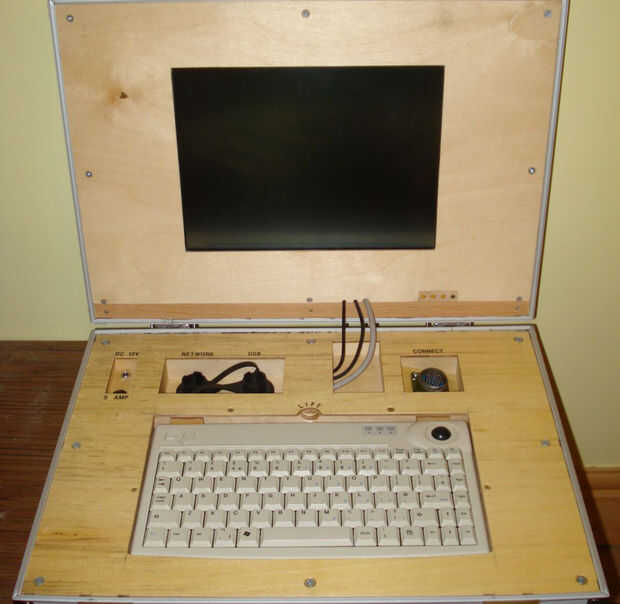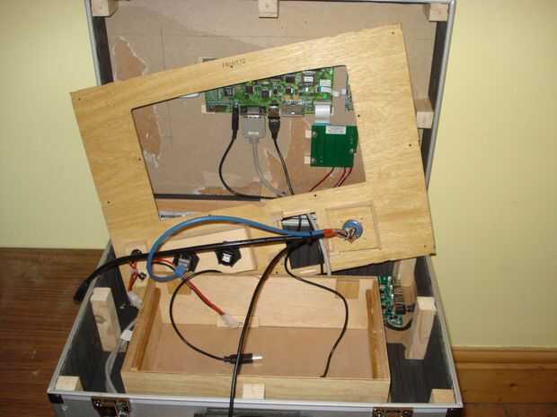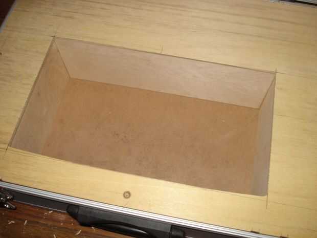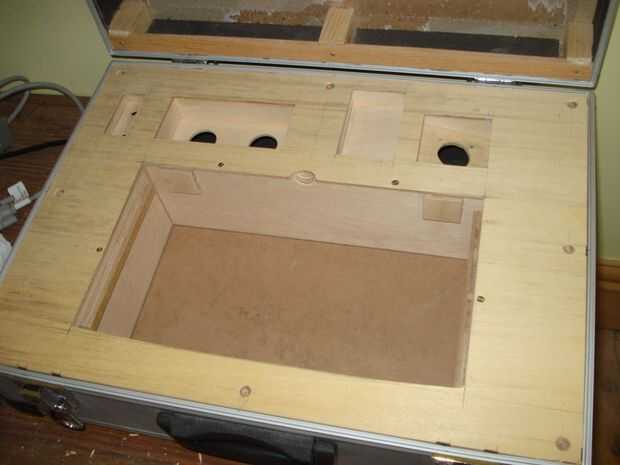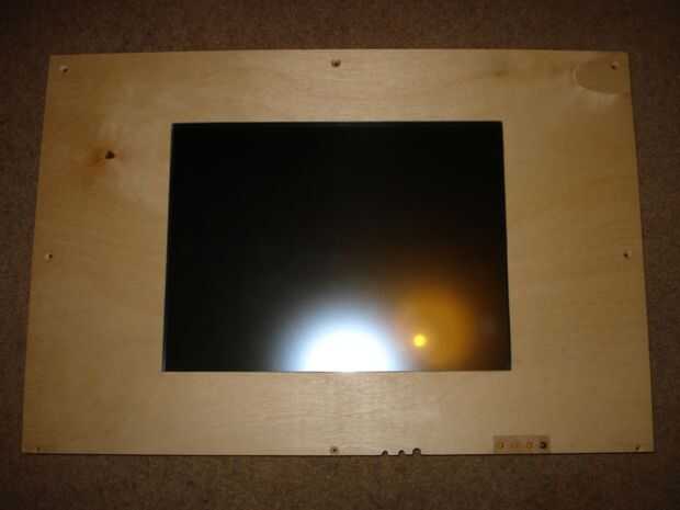 Se corta una abertura en el panel lo suficientemente amplio para el combo de teclado y trackball caber dentro. A tornillos de sección de caja para el panel de madera contrachapada y corredores equipadas dentro. El teclado descansa contra los rieles para que se sienta con el panel de madera contrachapada. Si el teclado fuera a sobresalir por encima del nivel del panel de madera contrachapada, hay una posibilidad que podría entrar en contacto con la pantalla LCD, causando daños a cualquiera de los dos artículos.