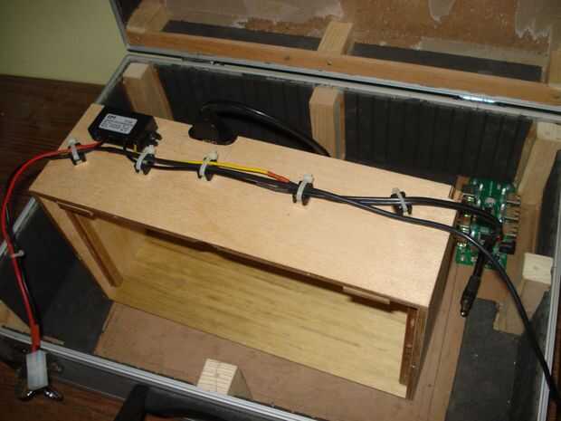 Fijado a la parte posterior de la sección más grande de la caja es los 12v a 5v DC CC. El convertidor proporcionará energía del concentrador USB.