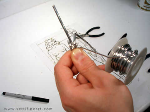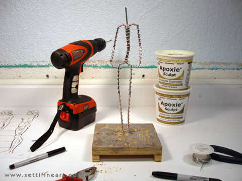 Una vez que estoy satisfecho con mi pose (o lo suficientemente cerca: yo siempre puedo retocarlo más tarde), me marca mi pieza de madera con un rotulador donde irán las clavijas de pie (hacerlo colocando mi armadura sobre mi trozo de madera en la pose aproximada). Entonces toma mi taladro confianza y hacer mis agujeros usando una broca de 1/8 (el mismo tamaño que mi cable de armadura). Si tiene acceso a una prensa del taladro es mejor como los agujeros en ángulo recto.