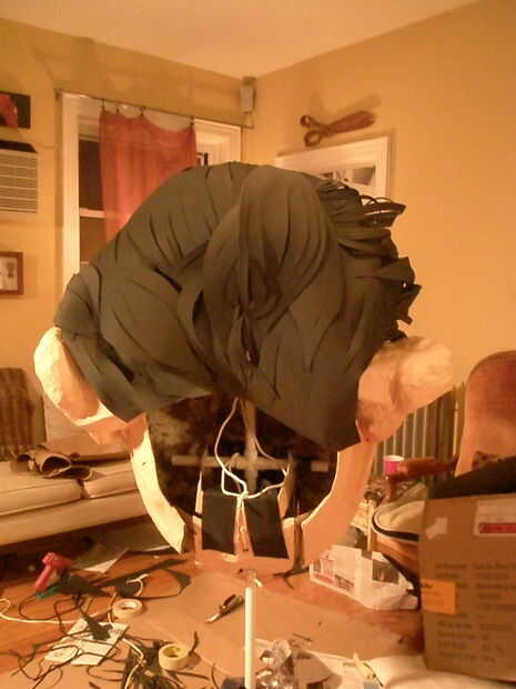 Para el cabello, utilizamos espuma EVA fina ("espuma de la diversión"). Ponemos una capa básica sobre toda cabeza, creación de la línea del cabello entrando y fijar con pegamento caliente. Para crear el efecto 3D, recortar secciones de hoja en forma de palmera gigante de la espuma de EVA y con una hoja que hicimos algunas ranuras en ellos. Luego atamos los en la cabeza desde cualquier borde de la "hoja", para que los filamentos del pelo tenían cierta profundidad y capas que les salieron un poco la cabeza.