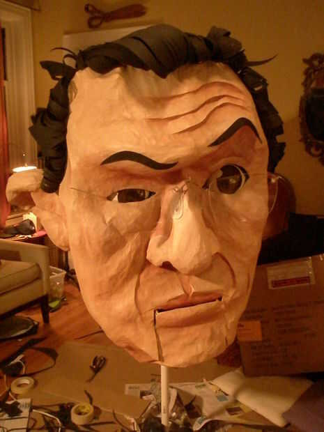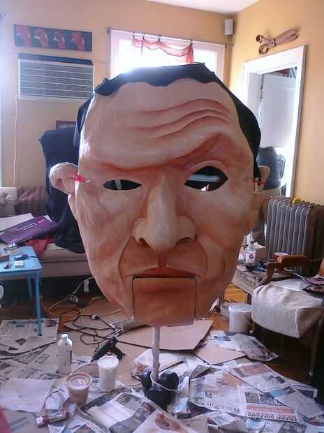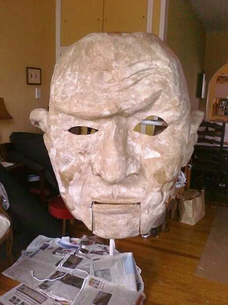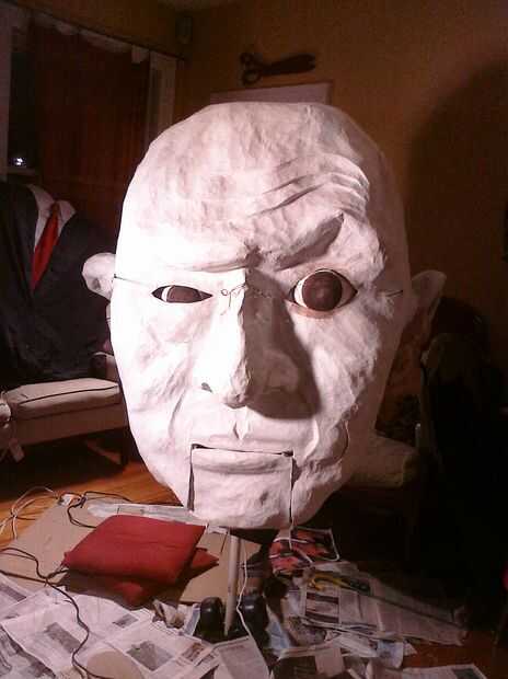 Se utilizó pintura acrílica y comenzó con una capa base blanca por todo de todo. Por los globos oculares, utilizamos esferas de plástico transparente cúpula (la mitad para cada ojo), pintadas desde el interior para mantener un brillante globo ocular (pupila, entonces iris entonces rociar pintura blanca). No atribuimos los hasta después la cabeza entera fue pintada. Con un lote grande de pintura de tono carne, cubrimos toda la cabeza y ambas manos, luego haciendo algunos matices con colores de pintura de tono más oscuro o más claro de la carne. Una vez que fuimos hecho pintura, puesto los ojos desde el interior de la cara usando pegamento y cartulina.
