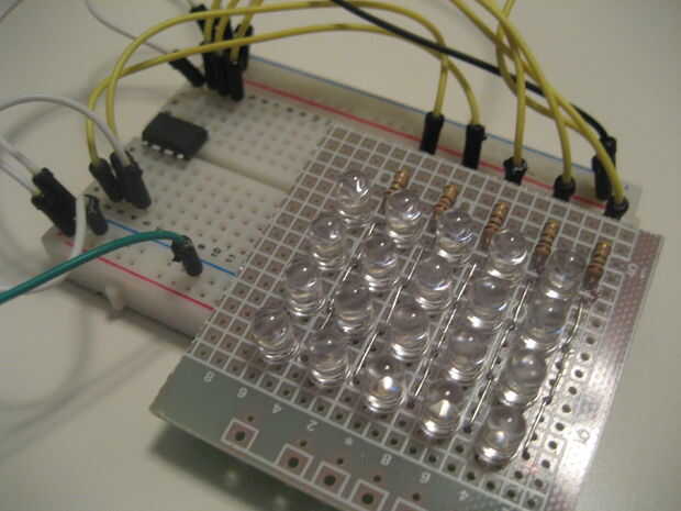 He decidido empezar con uno de lo AVRs más pequeño disponible, ATTiny85 con solo 8 pines. Con sólo 5 clavijas de salida disponibles para mí (con 6 me haría perder otras funciones del chip), decidí experimentar con Charlieplexing. Charlieplexing permite controlar muchos LEDs con muy pocas clavijas de salida, por el cableado un LED en ambas direcciones para cada posible combinación de pares de los pernos. En mi caso, 5 pernos permitiría el control de hasta 20 LEDs (5 x (5 - 1)). Esto sólo requiere el ATTiny, LEDs, resistencias de 5 y una fuente de energía.