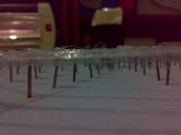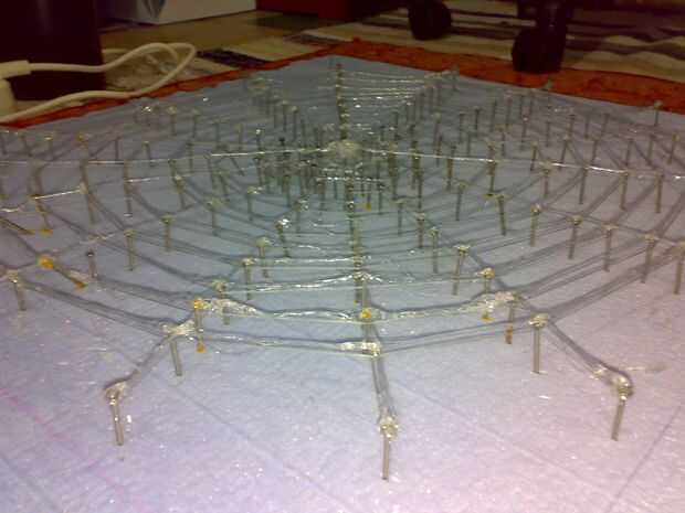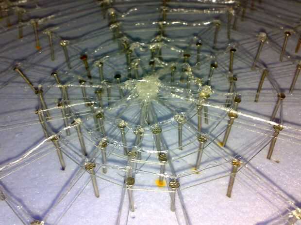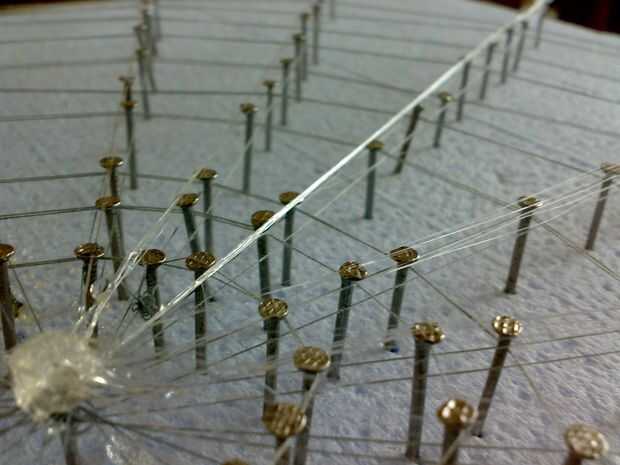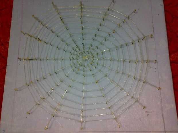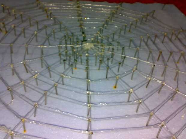 Inicio del centro de forma y su cola los caminos que se crean por la cuerda alrededor de las uñas. Pegamento primero los caminos verticales. Vertical que serán nuestras conexiones principales y de apoyo. Después de pegar cada camino, usar jeringa para verter agua sobre ellos. Usted puede ayuda de un amigo. Mientras que están vertiendo pegamento, tu amigo puede verter agua.