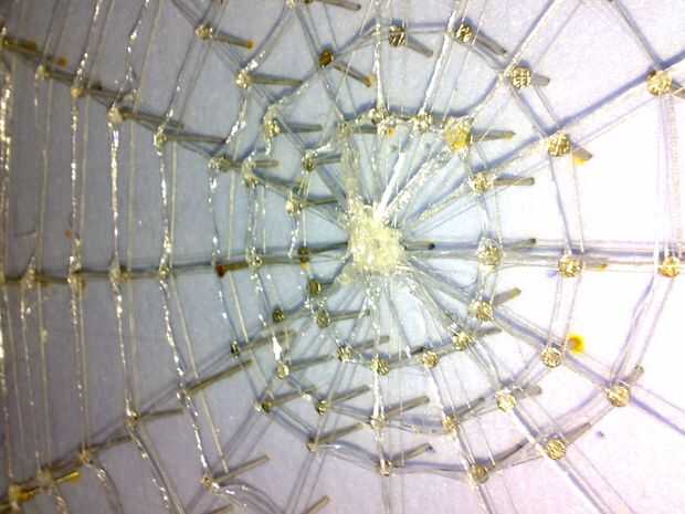 Terminar primero las líneas verticales. Comienzan entonces los cíclicos. Crear tu pieza circular de tus webs. Jeringa otra vez debe estar listo para refrescarse abajo. Si tu pistola de pegamento demasiado caliente y si el pegamento es muy líquido como se enfríe desenchufe. El pegamento que está saliendo de su arma debe ser como la miel. La viscosidad debe ser alta.