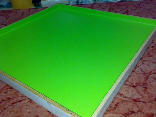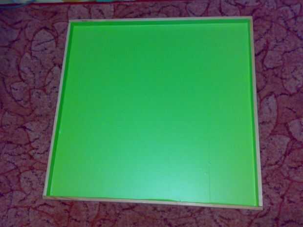 Me tomaron una placa de madera 40 x 40 cm (ancho y longitud) y añadir la altura de 2 cm a sus lados cercanas. Luego cubro mi caja con pegatinas grandes. He utilizado el verde.
