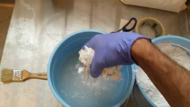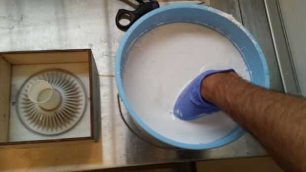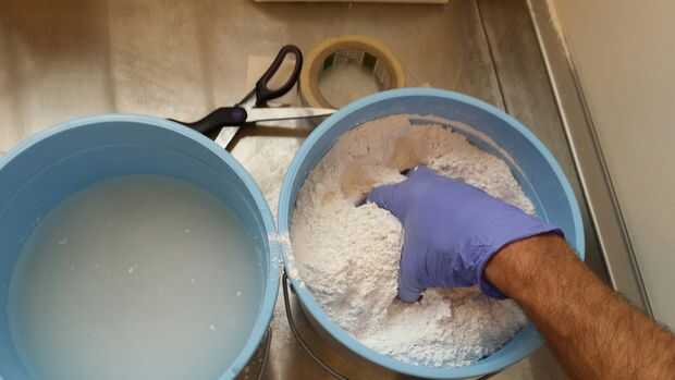 En este estado el yeso sin mezclar puede sentarse por horas y no endurecen. Sumerja lentamente la mano en el yeso para sentir cualquier grumos gruesos. Romper para arriba y comience a revolver lentamente el lote. Tenga cuidado de no para introducir aire en la mezcla. Burbujas de aire que ser fácilmente atrapadas en la mezcla como cura, que puede ser muy problemático en el proceso del bastidor, como se verá más adelante en una forma diferente.