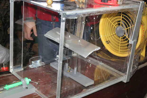 Corte dos pedazos pequeños (cada uno de aproximadamente 2 pulgadas de largo) la barra de pasador. A continuación, perfore un agujero del mismo tamaño que perforó en el plexiglás en el centro de cada bloque de madera pequeño. Luego perfore dos agujeros pequeños en cada lado del agujero grande para poner el alambre piano muy cómodamente en el. Asegúrese de que alinean los agujeros en un bloque con ésos en el otro bloque. A continuación, pegue un pedazo de barra de espiga en cada bloque de madera. Poner alambre de piano a través de los agujeros más pequeños en uno de los bloques, haciendo que el cable esté señaló la dirección opuesta de la varilla de pasador. Poner el cable de piano en los agujeros correspondientes en el otro bloque. A continuación, inserte la varilla de pasador sobresale de la parte inferior de un bloque de madera más grande en el agujero previamente perforado en el fondo del túnel de viento. Asegure el bloque a la parte inferior del túnel de viento con epoxi. Después de eso, atornille el gancho pequeño en menor bloque de madera entre los alambres del piano. Inserte la varilla de pasador sobresale de la parte superior de un bloque de madera pequeño en el orificio previamente perforado en la parte superior del túnel de viento.