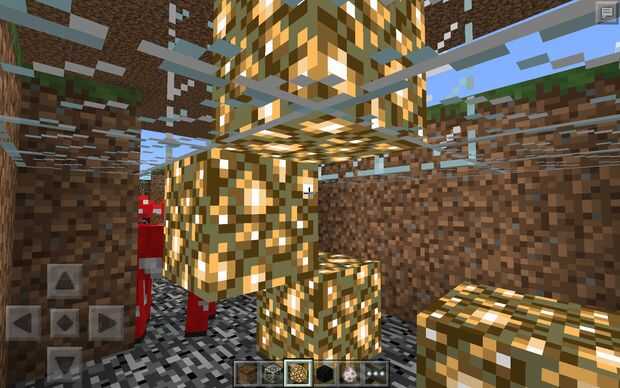 Mientras tanto, bajo el podzol, está oscureciendo, así que agregamos algunos faroles para iluminar la primera capa [1]. Agregar escaleras con piedra brillante en forma de espiral, dentro de la torre [2-4].