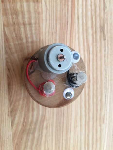 El motor es muy similar a la batería. Usted tiene que pegar primero el motor en un bloque de madera, como el paquete de baterías. Podría ser un poco complicado, porque la parte inferior del motor tiene una pequeña protuberancia. Otra vez, tienes que pegar o Martille los clavos en y enrolle el cable alrededor. Por último, pegamento caliente los cables a las uñas como antes, y ya está con sus tres componentes principales.