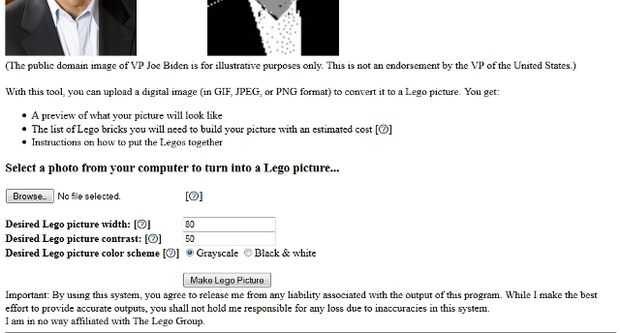 Haga clic en el botón "Hacer imagen de Lego". Si te gusta el escuchar y el costo estimado, eres bueno para proceder. Si no, ajustar el ancho y el contraste y vuelva a enviarla.