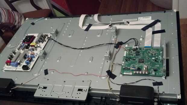 - Con un destornillador, desenroscar los tornillos que sujetan la placa de respaldo en su lugar y retire la placa de respaldo. Debería ver algo similar a la primera foto de arriba. Por suerte, el Vizio que seleccioné es muy simple y no tiene demasiadas tablas. En el caso de no atenerse con la Vizio y optó por algo más, aquí va un desglose de lo que verás: