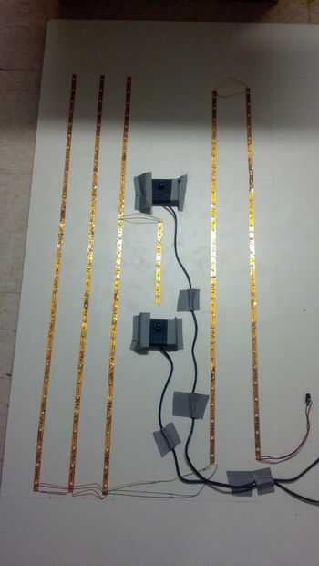 - Suelde el positivo al positivo y el negativo al negativo como trivial. El adaptador de corriente para los LEDs también debe conectarse a éstos de alguna manera. Puede soldar directamente, comprar a un jack hembra, o simplemente gire y cinta.
