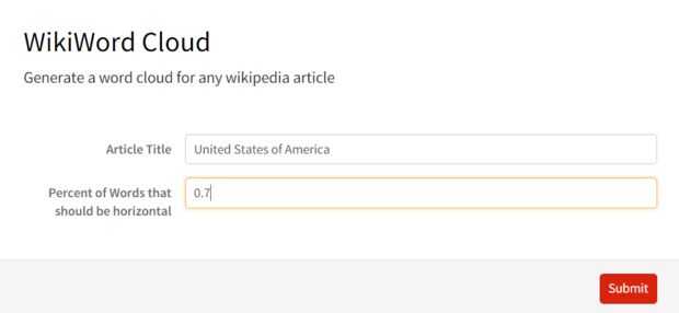 CloudDeploy [FormFunction [{{"sujeto", "Título del artículo"} -> "String", {"horiz", "Por ciento de las palabras que deben estar horizontales"} -> «Número»}, WordCloud [DeleteStopwords [WikipediaData [#subject]], WordOrientation -> {"HorizontalVertical", #horiz}], "PNG", AppearanceRules -> < | " Title"->"WikiWord nube","Descripción"-> «Generar una nube de word de cualquier artículo de wikipedia» | >],"WikiWordCloudform", permisos ->"Público"]