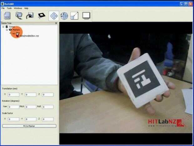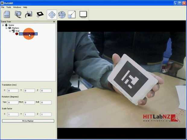 3. en la escena del árbol (a la izquierda) hay será una subpartida como marcador---hiro---a continuación un cuadro rojo denominado como data/models/box.ive
