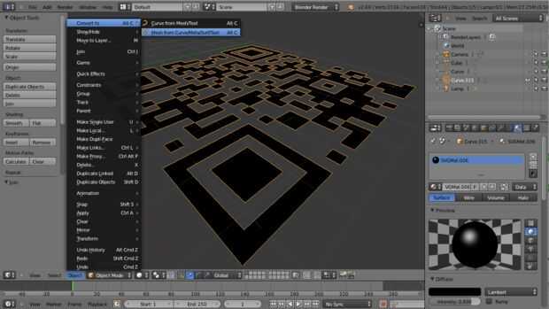 2. después de importar, el objeto parece ser muy pequeño así que la escala a un tamaño viable. Todos los objetos son 'Curvas' no malla. No tienes que lidiar con el tamaño exacto sin embargo, como se puede hacer el tamaño final en el software de la impresora 3D. Te darás cuenta hay un plano blanco plana a través de su código QR, no necesitamos esta borrar así que plano o esconderlo. El avión debería llamarse 'Curve' (como se ve en la foto)