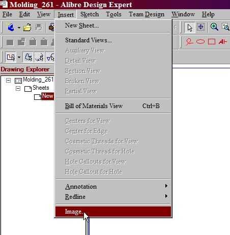 Asegúrese de que la nueva destaca en la columna de explorador de dibujo. En el menú Insertar, seleccione imagen. Aparece el cuadro de diálogo Seleccionar imagen. Navegue hasta la ubicación guardada de la imagen que desea insertar. Haga clic en el nombre del archivo de la imagen. Haga clic en abrir. Aparece la imagen flotante en el espacio de trabajo dibujo y el puntero del ratón ha cambiado a un icono de punteado de mira. Haga clic en el icono de punto de mira en la hoja de dibujo para colocar la imagen de cerca (pero no sobre) la esquina inferior izquierda de la imagen. La esquina inferior izquierda representa la posición del origen en una pieza o conjunto. Esta colocación de imagen nos ayudará más adelante.