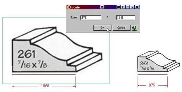 Nuestra imagen es más grande que queremos, el perfil de sí mismo nos dice que es moldeado #261 7/16" de alto x 7/8" ancho. Así que usando la lógica que una proporción de.5 1.0 hacer nuestra imagen la mitad tan grande. Vamos a poner el tamaño que queramos (7/8 =.875) a la izquierda y el tamaño que tenemos (1.868) a la derecha y haga clic en Aceptar.