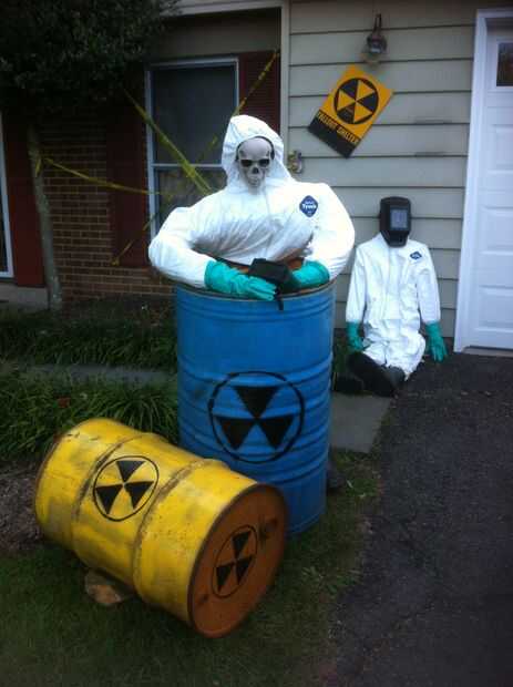 El plan es agregar lo que mi esposa llama mi "Redneck Tiki Torch" que es simplemente un regulador de propano conectada a una válvula y un tubo largo de latón con una lata puede asomó llena de agujeros en la parte superior. Se ve como una gran bola de llamas en el extremo de la tubería. en la hierba junto al tanque será un vacío, repita vacíe el tanque de oxígeno con la tapa de seguridad en él y otro vacíe el tanque de CO2. Dentro del barril amarillo será una luz verde con verde niebla saliendo de fabricación de hielo seco.