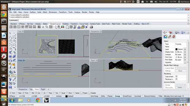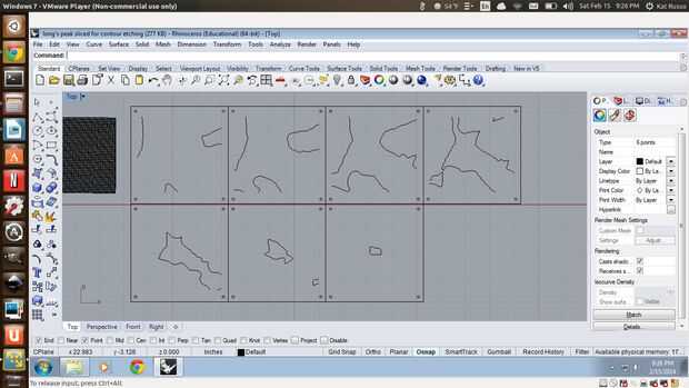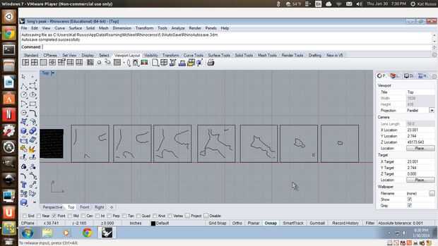 Utilice el comando contorno y ajuste la distancia entre los contornos como el grosor del acrílico. Dependiendo de cuántas líneas quieres, quizás tenga que redimensionar el modelo en consecuencia. No proyecto las líneas al plano C todavía, sólo mover el modelo 3D de referencia fuera del camino. Seleccionar la capa inferior de contornos (he encontrado que es más fácil utilizar la herramienta de selección de caja, para que usted no se olvide de seleccionar toda la capa) y con el cuadro delimitador (imagen 2). Mover el grupo al lado, hacer otro recuadro y repite el proceso hasta que cada capa contorno tiene su propio recuadro (imagen 3). Entonces, todo al plano de C, mientras que en la vista superior del proyecto.