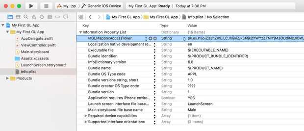 - En la nueva fila que se inserta, poner la llave MGLMapboxAccessToken y establezca el valor en su token de acceso.