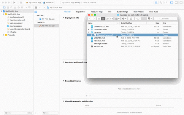 Ahora que ha creado un proyecto de Xcode, vamos a instalar el iOS Mapbox SDK. Descargar la última versión como un marco dinámico, descomprima el archivo descargado y luego arrastrar y soltar Mapbox.framework en la sección Binarios embebidos de su proyecto: