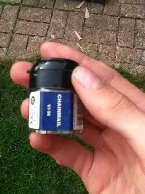 Usé pintura de Chainmail Warhammer. Brilla metal genuino así es un agradable después del efecto. Utilicé un pincel pequeño para aplicar una capa fina en el borde que había arena. Esto hace parecer la lámina tiene una capa protectora negra y el metal en el borde se expone todavía. Hice esto ya que es lo que parece el machete de jungla de CS.