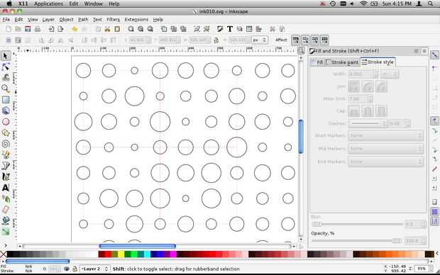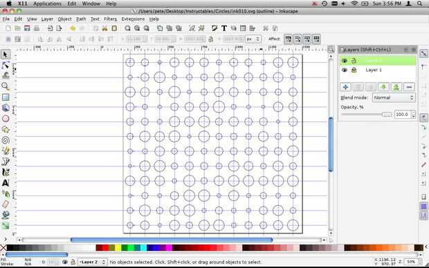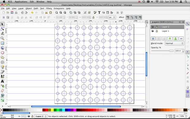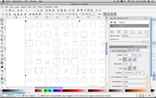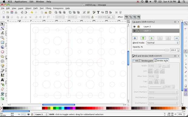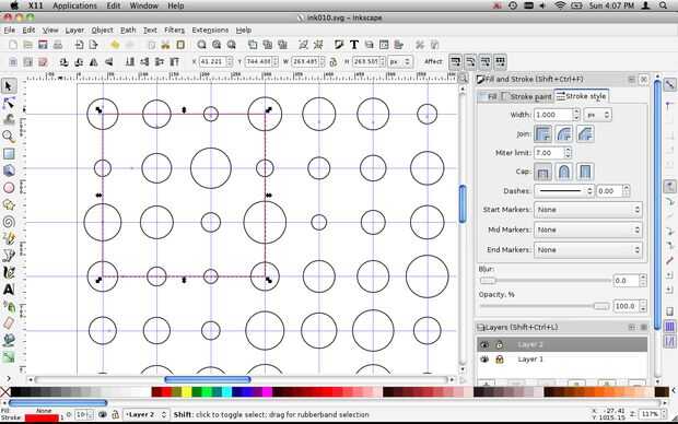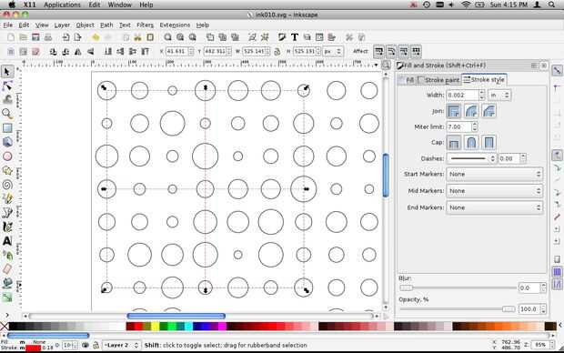 Muy bien! Ahora que tenemos el diseño básico hacia abajo, es hora de preparar nuestro archivo de grabado y corte por láser. Seleccione todas las líneas rojas y cambiar la carrera para ser 0,002" de ancho. Si estás en el modo de vista "Normal", usted verá que las líneas rojas son apenas visibles. Una vez hecho eso, bloquear capa 2, desbloquear capa 1 y seleccione todos los círculos negros y darles un 0,002" accidente cerebrovascular así. Las líneas negras, al igual que las líneas rojas, deben ser apenas visibles. La idea aquí es, que vamos a utilizar las líneas negras para grabar con el láser de corte, y entonces las líneas rojas para cortar cada pieza hacia fuera y termina con 4 piezas que funcionan como un conjunto, ya que encajan entre sí. Hemos hecho las líneas muy fina (a veces llamado "rayita") para que el cortador del laser los ve como arte del vector.