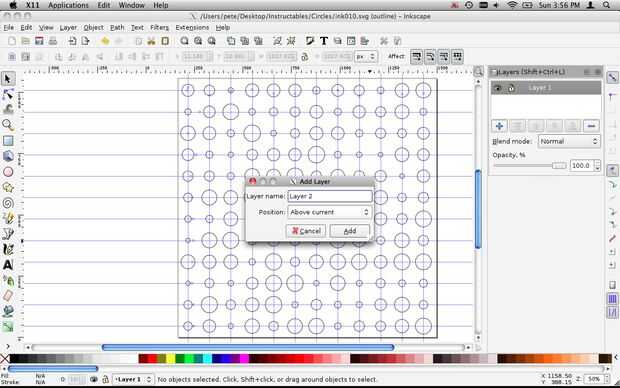 Empezaremos dibujando unos cuadrados a lo largo de las directrices. En primer lugar, crear una nueva capa en Inkscape, por lo que en el menú "Capa" a ver "Capas...", que mostrará la paleta de capas. La capa actual es la "Capa 1" así que si hacemos clic en el signo más vamos a añadir otra capa. A llamar la nueva una "capa 2" y colocar encima de la capa actual. (También puede bloquear capa 1 por ahora, ya que no se haciendo las ediciones que por ahora).