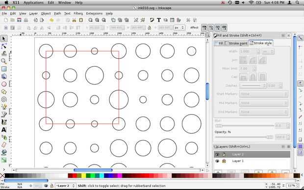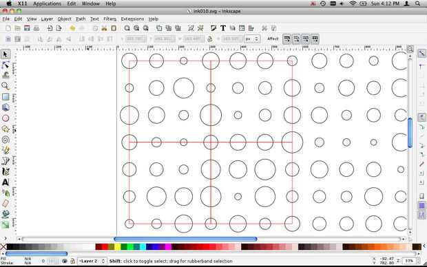 Ahora usaremos la herramienta Rectángulo para dibujar un cuadrado. (Vamos a cambiar al modo de visualización "Normal" en el menú "Ver" primero aunque.) He dibujado mi plaza para cubrir 9 secciones de la red, o un área de 3 x 3. Si su movimiento es demasiado fino puede ser difícil de ver, así que cambiar la carrera para ser por lo menos 1 píxel de ancho y elija un color además de negro, algo como rojo es una buena opción. Si apagamos las "guías" en el menú "Ver", las cosas son mucho más fáciles de ver. Ahora debemos tener una plaza roja corte círculos por la mitad alrededor del perímetro y unos círculos completos en el medio. A copiar y pegar el cuadrado rojo y coloque tres más hasta que tengamos cuatro cuadrados en total, en una cuadrícula de 2 por 2. (Utilice a las guías para ayudarle a posicionar y cambiar entre "Normal" y "Esquema" modos de visualización. (Siempre puede eliminar todos los círculos extras que entran en el espacio que realmente usaremos, o se podrían definir más zonas a cortar).