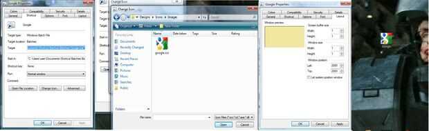 Así que haga clic con el botón derecho el archivo de atajo de "Google" y haga clic en propiedades y en la pestaña de corte corto, haga clic en "Cambiar icono" (ignorar el cuadro que aparece)