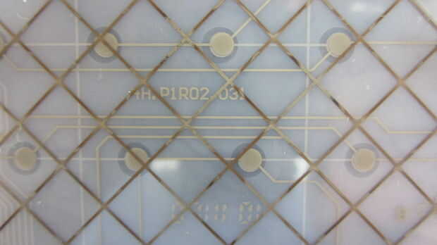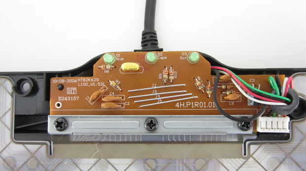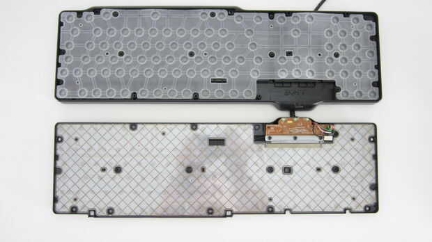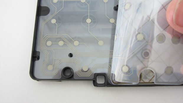 Las hojas de plástico grabadas conectan a un tablero de circuito pequeño. Cada vez que se pulsa un botón, los contactos del toque de hojas de plástico y la placa de circuito registra movimiento clave.