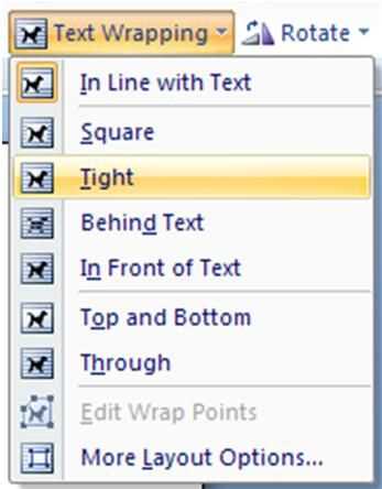 El primer cambio que debe hacerse es cambiar el ajuste del texto de la imagen. Ir a formato, ajuste de texto y jale hacia abajo el menú. El ajuste predeterminado del texto es generalmente "en línea con texto". Usted quiere elegir "Apretado". Esto permitirá que las imágenes que se moverán más libremente en la página.