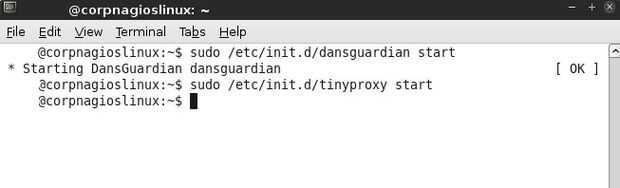 Por fin que necesitamos iniciar los servicios. Otra vez en una terminal, emita los siguientes comandos: Inicio de $ sudo /etc/init.d/dansguardian Inicio de $ sudo /etc/init.d/tinyproxy