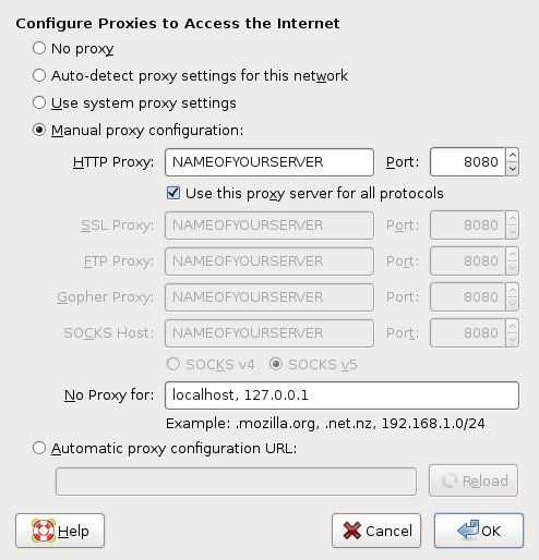 Haga clic en "Configuración Manual de Proxy", en "Proxy HTTP" escriba la dirección IP o nombre de host del servidor Proxy. En el campo "Puerto", ingresar 8080. Haga clic en "Usar servidor proxy para todos los protocolos". Haga clic en Aceptar para aplicar la configuración y solicitar una página.