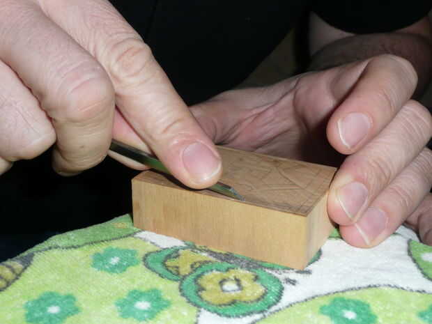 Mantenga la mano en una posición bastante fija. A la hora de corte a solo mueves hacia adelante y hacia atrás como necesario y mover la madera debajo de ella con la otra mano al corte. Tienes que averiguar el ángulo de corte que no es tan alto que mantiene atasco la hoja y no tan baja que skitters demasiado fácilmente en la parte superior de la madera. Tómate tu tiempo. Respire fácilmente. Pero tratar de no cometer demasiados errores. Incluso muy poco profundos arañazos son difíciles de eliminar y puede mostrar en la final de la impresión. Esto es donde cuenta la paciencia. Más catártico poco, si lo desea. O la más estresante.