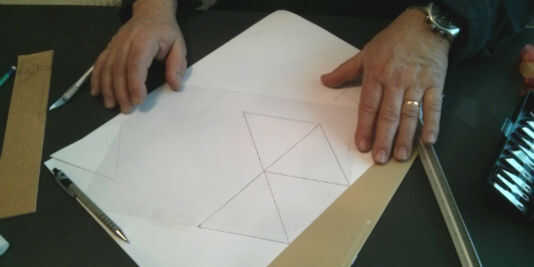 La forma de la pirámide, teniendo en Cuenta las Dimensiones, de han de marcarse en la plancha de plástico con cuatro triángulos, de tal forma Que Una Vez se recorte se Pueda montarse la pieza.