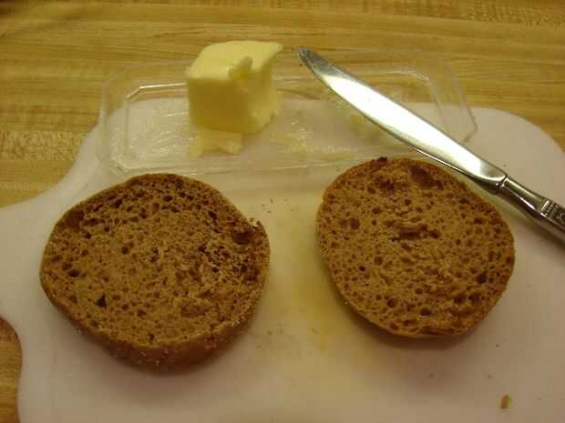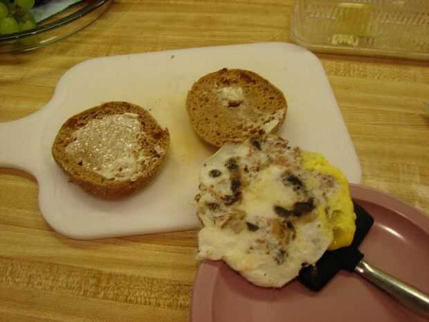 Cuando el huevo esté cocinado al gusto (poco o nada líquido y sólido yema para mí), sacar de la sartén y coloque en panecillo preparado.