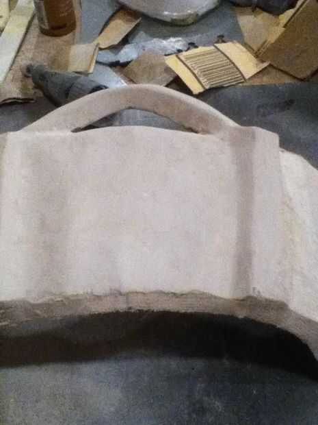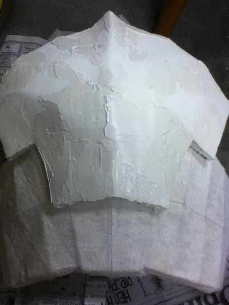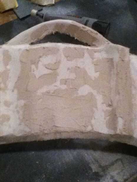Para este paso he probado utilizando un método diferente, teníamos la esperanza de que realmente no funcionan tan bien como yo. Tomé las capas de tela y pegado en mezcla agua y pegamento y cepillando en. Luego cubrí la estopilla con compuesto de juntas. Al principio me gusta esto porque spackle es mucho más fácil a la arena de bondo, pero el problema es que spack grietas muy fácil, por lo que no recomiendo este método. Sin embargo hubo una pieza que cubierto en una gasa y luego en bondo, bruja parecía funcionar bien, pero era algo innecesaria hacerlo así, pero ya que la pieza ya estaba cubierta en la estopilla lo probé. Lo que te recomiendo es que acabamos de hacerlo la manera normal que es cubierta en bondo y luego lijar. Déjenme decirles que tarda mucho lijado, de todos modos para mezclar su bondo tomar una gota del tamaño de una pelota de golf y poner una cantidad del tamaño de un guisante de endurecedor y luego mezclar. Mezclar sólo no meneallo, doblarlo y mancharlo. Por cierto, usted tendrá una superficie no porosa para mezclar el bondo en. Una vez más usar el respirador, bondo desprende humos tóxicos.