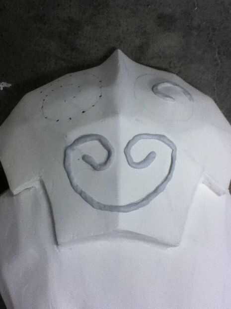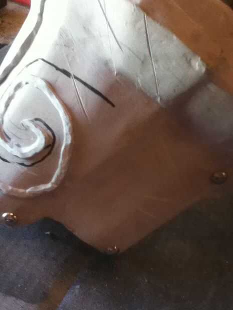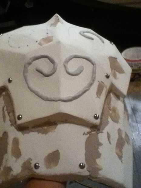 a partir de ahora la armadura parece muy simple y necesita algunos detalles más. Para las cosas de diseño swirly utiliza y masilla de epoxy laminado fino y presiona sobre la pieza. Sé que los diseños no son exactamente precisa del juego, pero hice llevar todavía parecen que son del Reino de Skyrim. Para los ríos utiliza un taladro para hacer pequeños agujeros y luego pegué clavos de tapicería en el lugar. Para el desgaste raspaduras y batalla simplemente tomé un archivo y maltratados los pedazos así que parecía que había sido a través de la batalla.