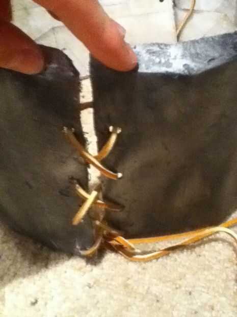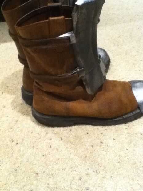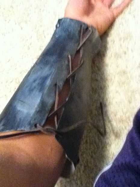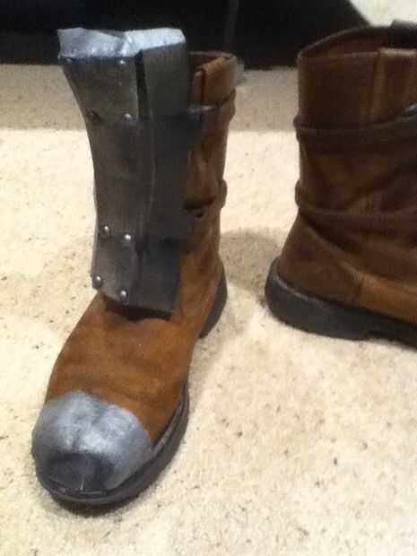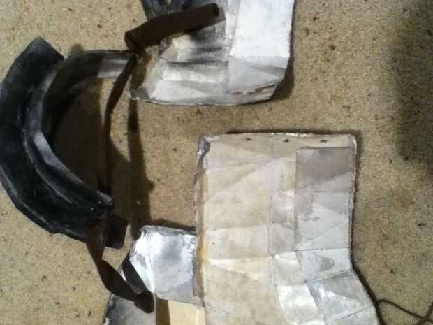 Para poner la armadura en tienes que hacer unos cortes, ojala usted corta el pecho en mitad anterior como mostré en la foto, pero de todos modos, así que pude poner hice cuatro agujeros en la parte delantera la mitad y la mitad posterior de la pieza del pecho. Luego utilicé un cordón de zapato de cuero a ate para arriba, utilicé el mismo método para los brazales. Para los hombros hice dos ranuras, una en la parte delantera y uno en la espalda y corrió una correa a través de él. En ambos extremos de las correas para coser un broche de presión sobre él, ya que la final masculino o femenino (que realmente no importa) y tomar la correspondiente pieza y pegarla a la armadura. Por lo que la correa se encaje en la pechera, pase por el pedazo del hombro y luego en la parte posterior. Ahora para las botas de Tomé y viejo par de trabajo botas y pegado a la pieza del dedo del pie en epoxi. Para el protector de shin he hecho las aberturas en las lengüetas pequeñas que sobresalen y recorrían una correa más y cosidas en.