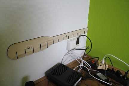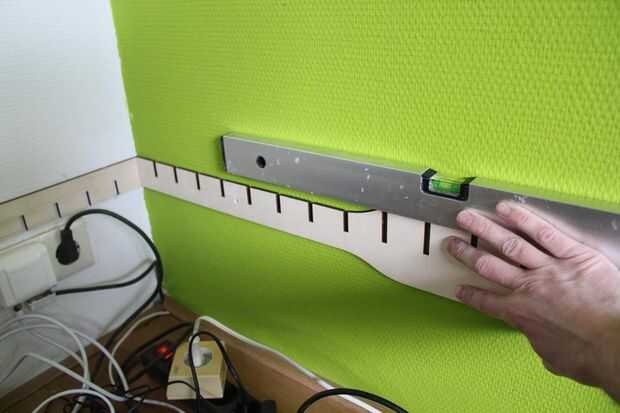 Coloque la primera parte en la altura apropiada. Me fijo tan bajo como sea posible ocultar tanto de los cables. Manténgalo nivelado y use un lápiz para dibujar una línea.